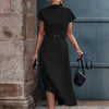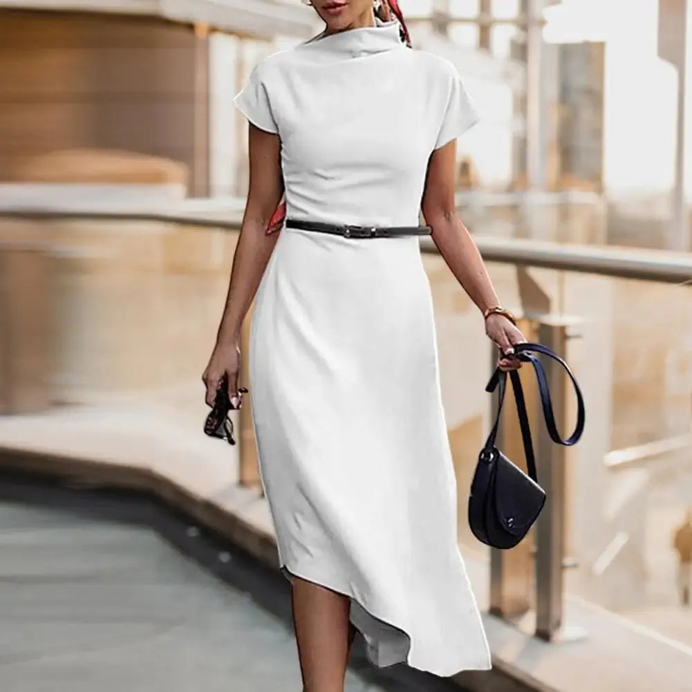 Asymetryczna elegancka sukienka midi z krótkim rękawem