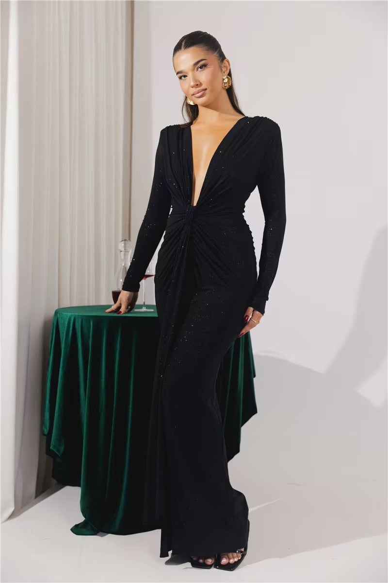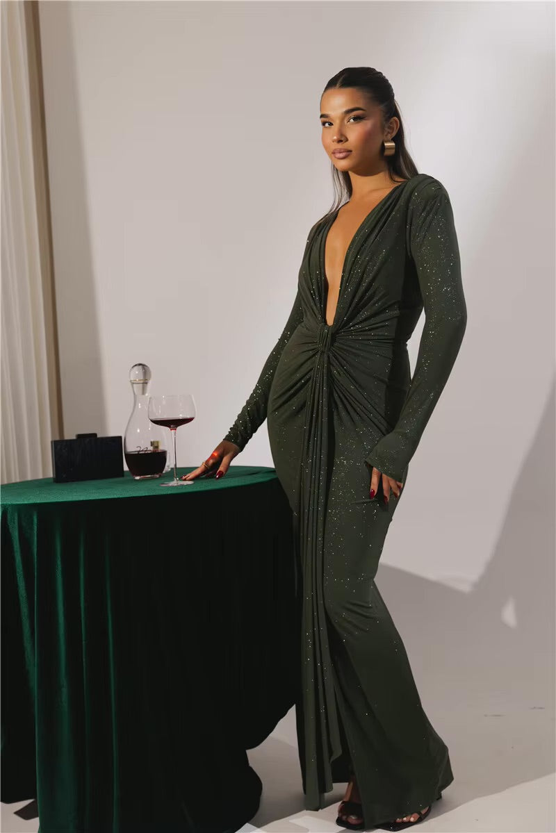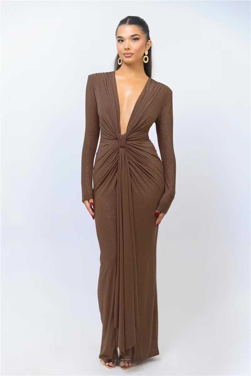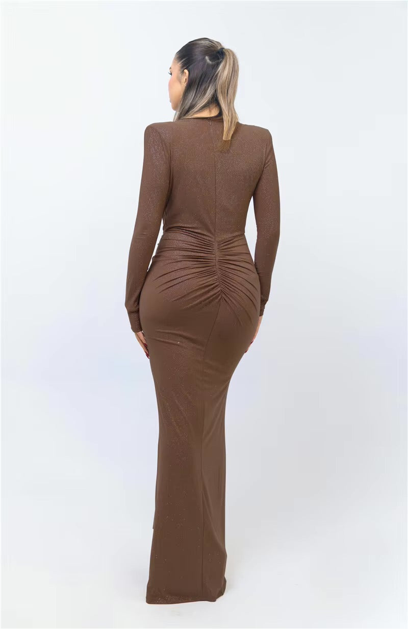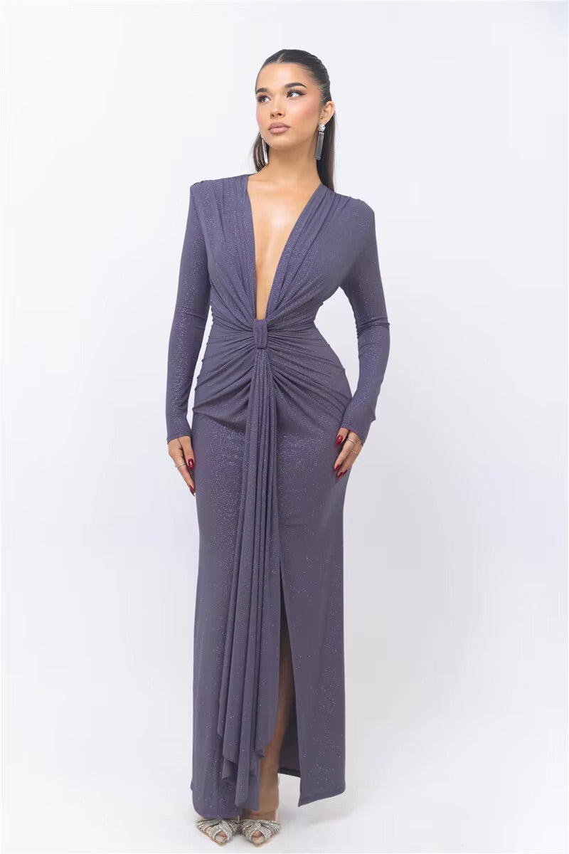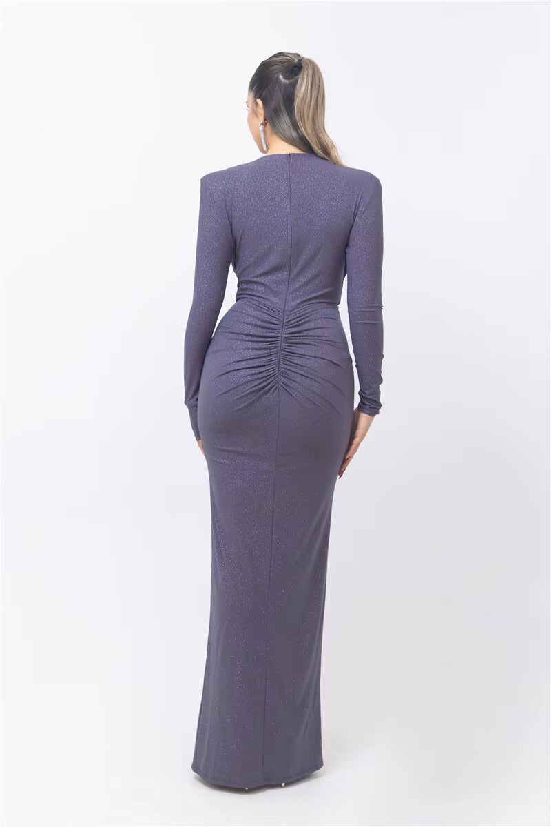 Długa błyszcząca sukienka z rozcięciem na nogę