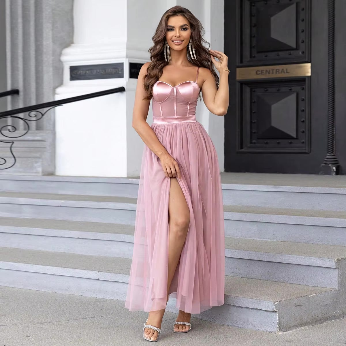 Wieczorowa sukienka midi z przezroczystej siateczki na ramiączkach